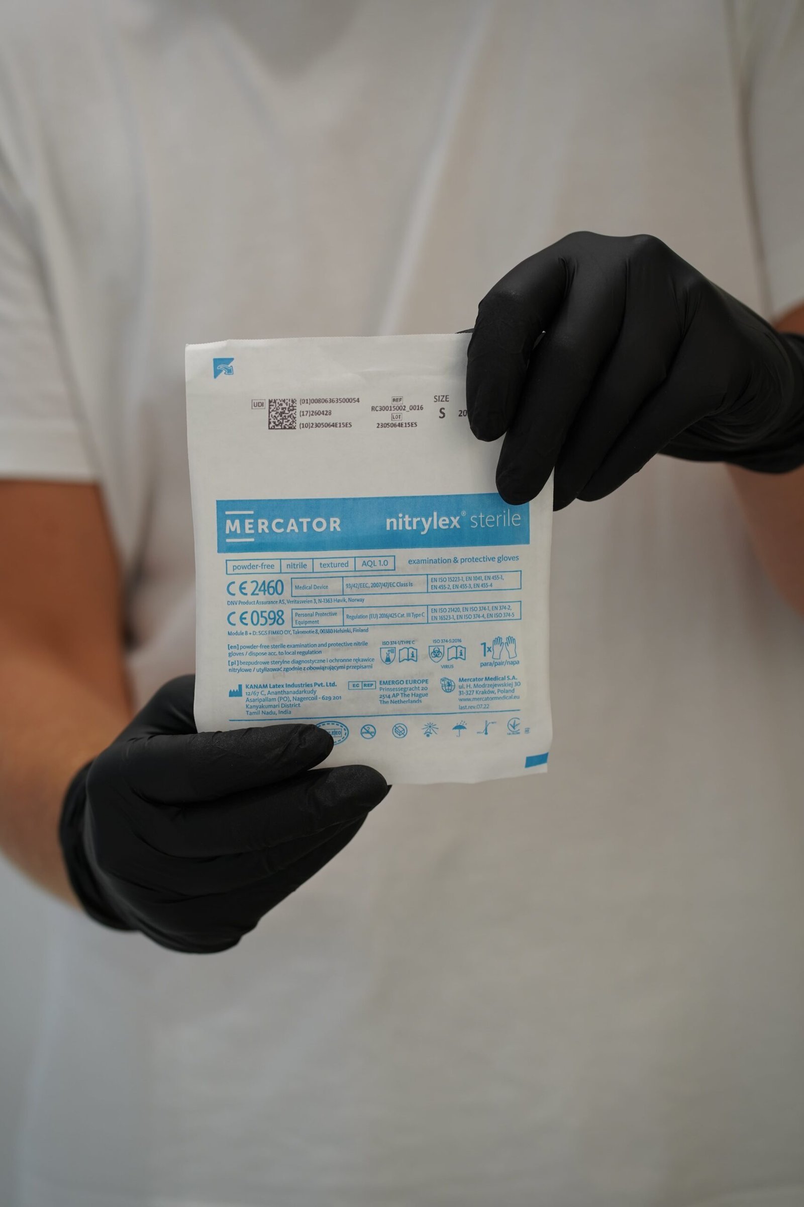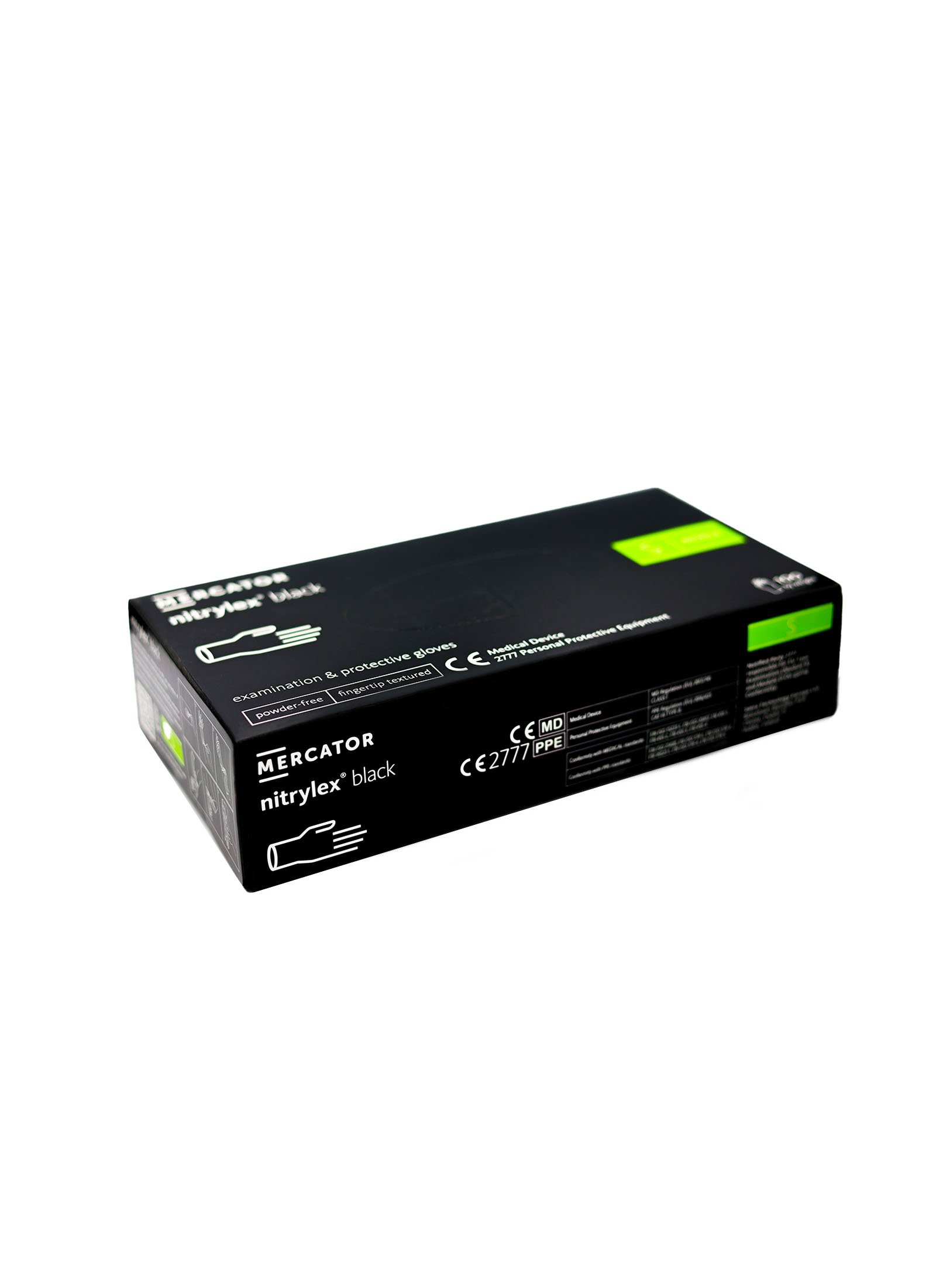 Mercator Nitrylex Black to klasyczne, bezpudrowe rękawiczki nitrylowe w kolorze czarnym, dostępne w opakowaniu zawierającym 100 sztuk. Rękawice nitrylowe to produkt niezbędny w każdym studiu piercingu. Rękawice nitrylowe w kolorze czarnym posiadają jeszcze jedną zaletę – nie widać na nim zabrudzeń.